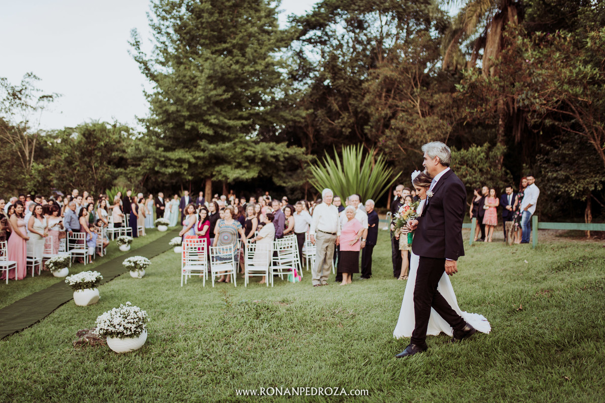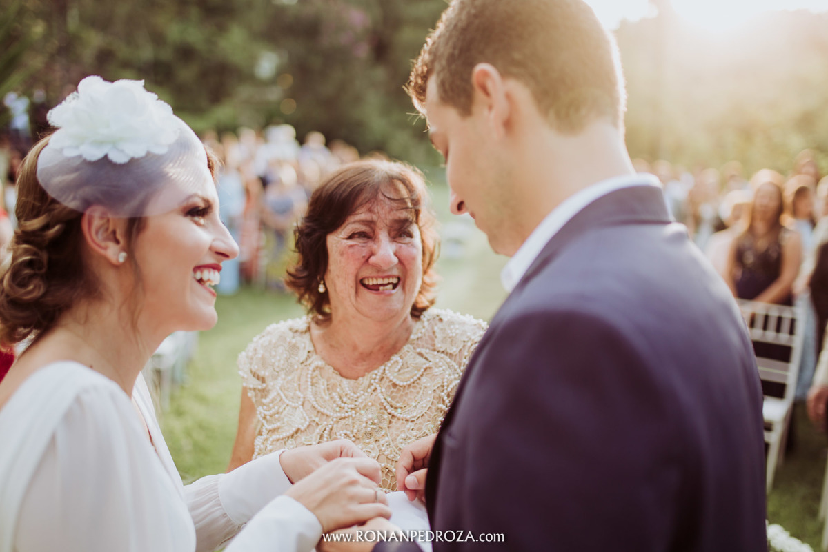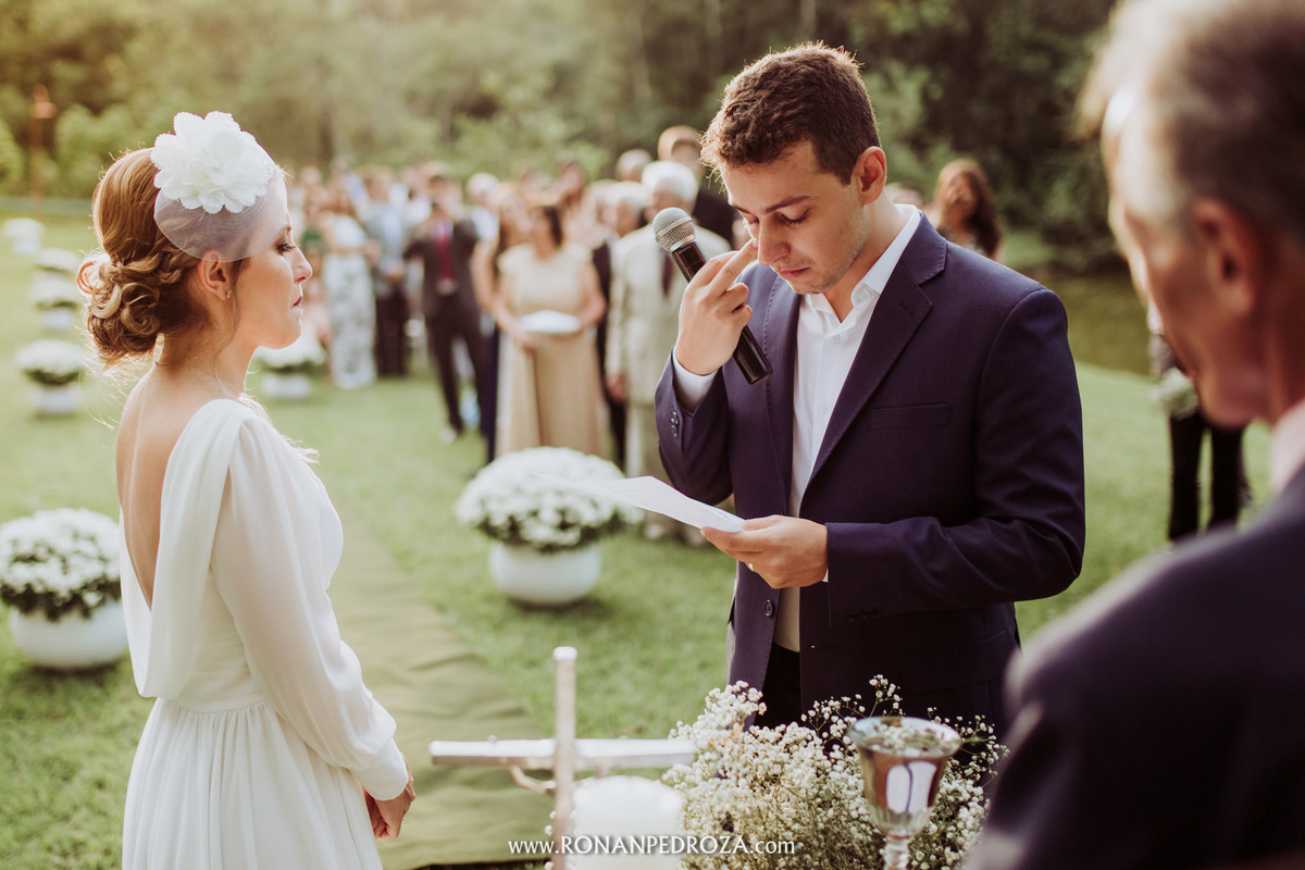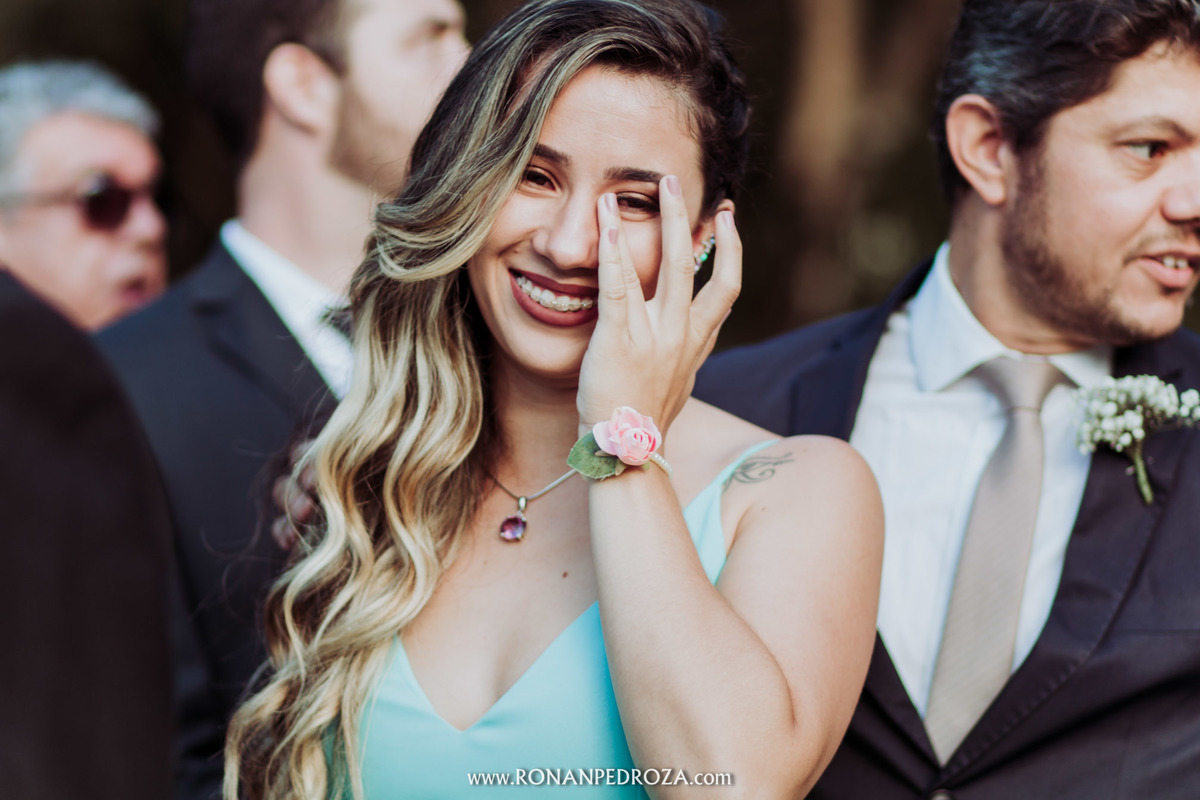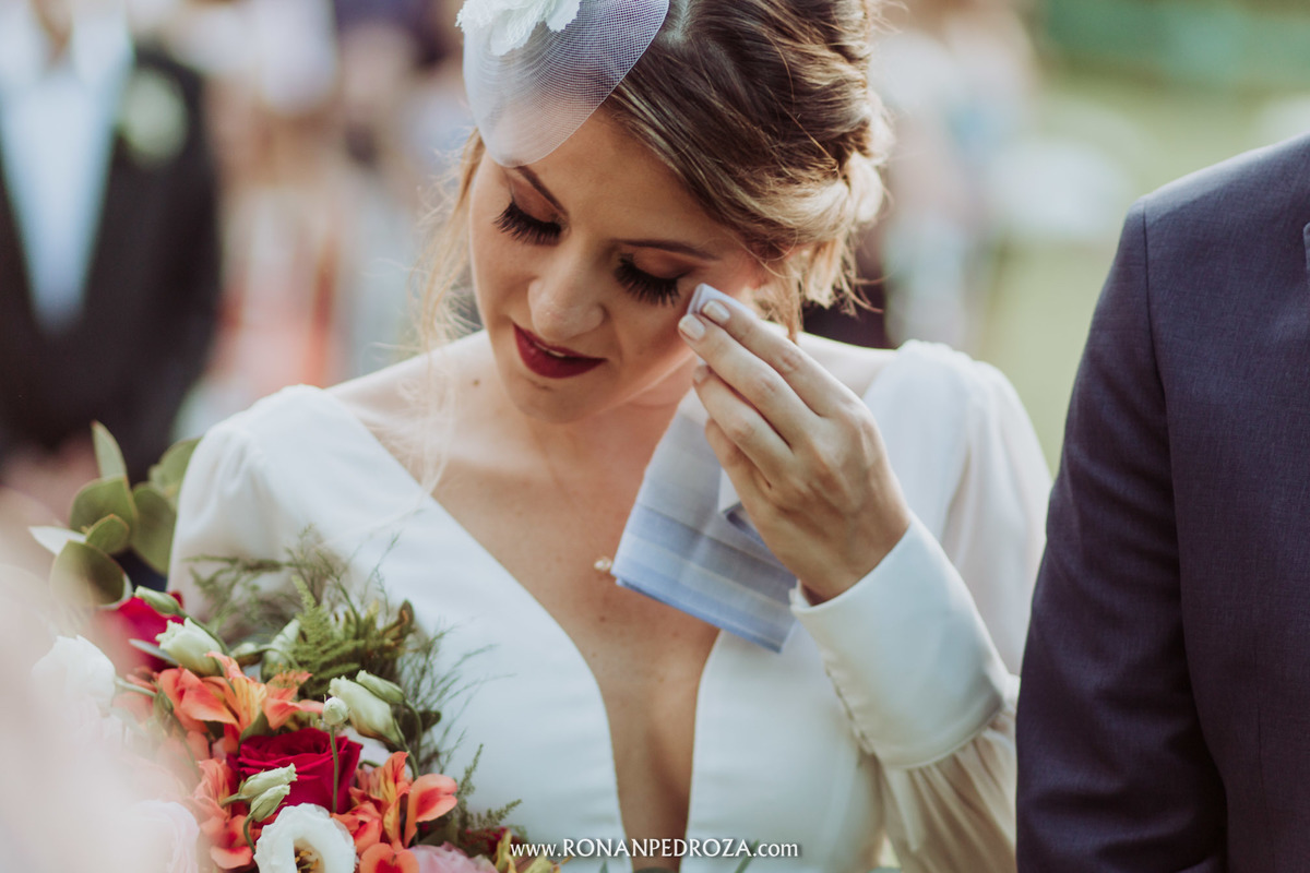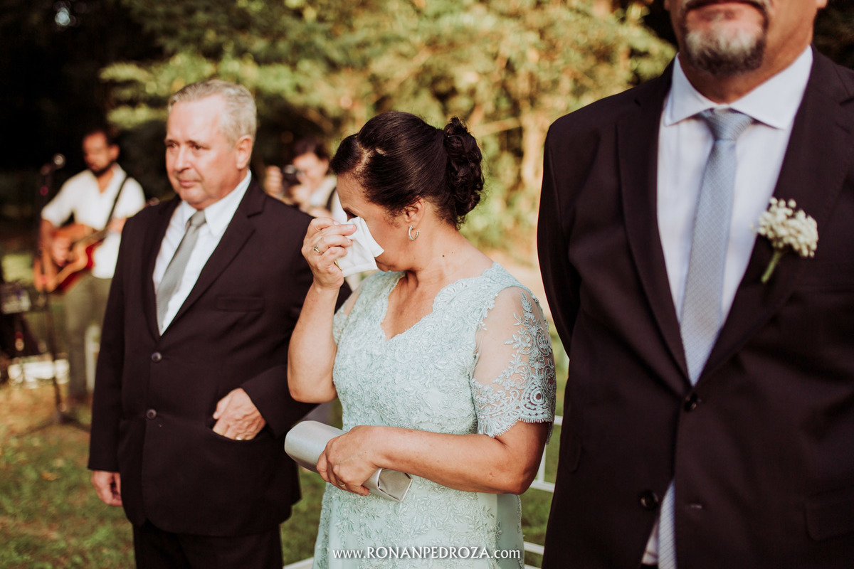 A emoção era tão grande, que dava para sentir a energia que o amor trouxe. Os convidados em lagrimas de alegria, o noivo em seu momento mais emocionante e a noiva, que foi ao altar de pés descalços, para sentir o amor de Deus, as bençãos prometidas e conectada diretamente com a natureza.