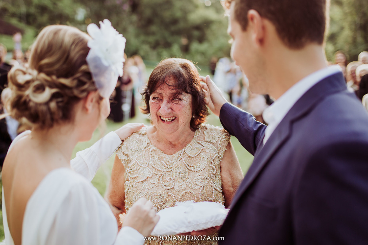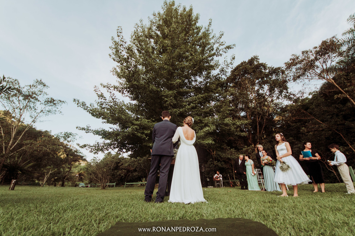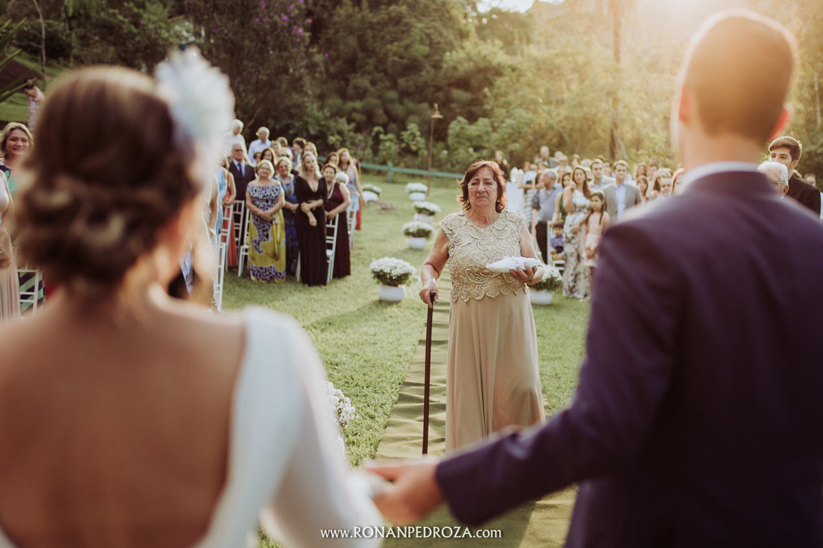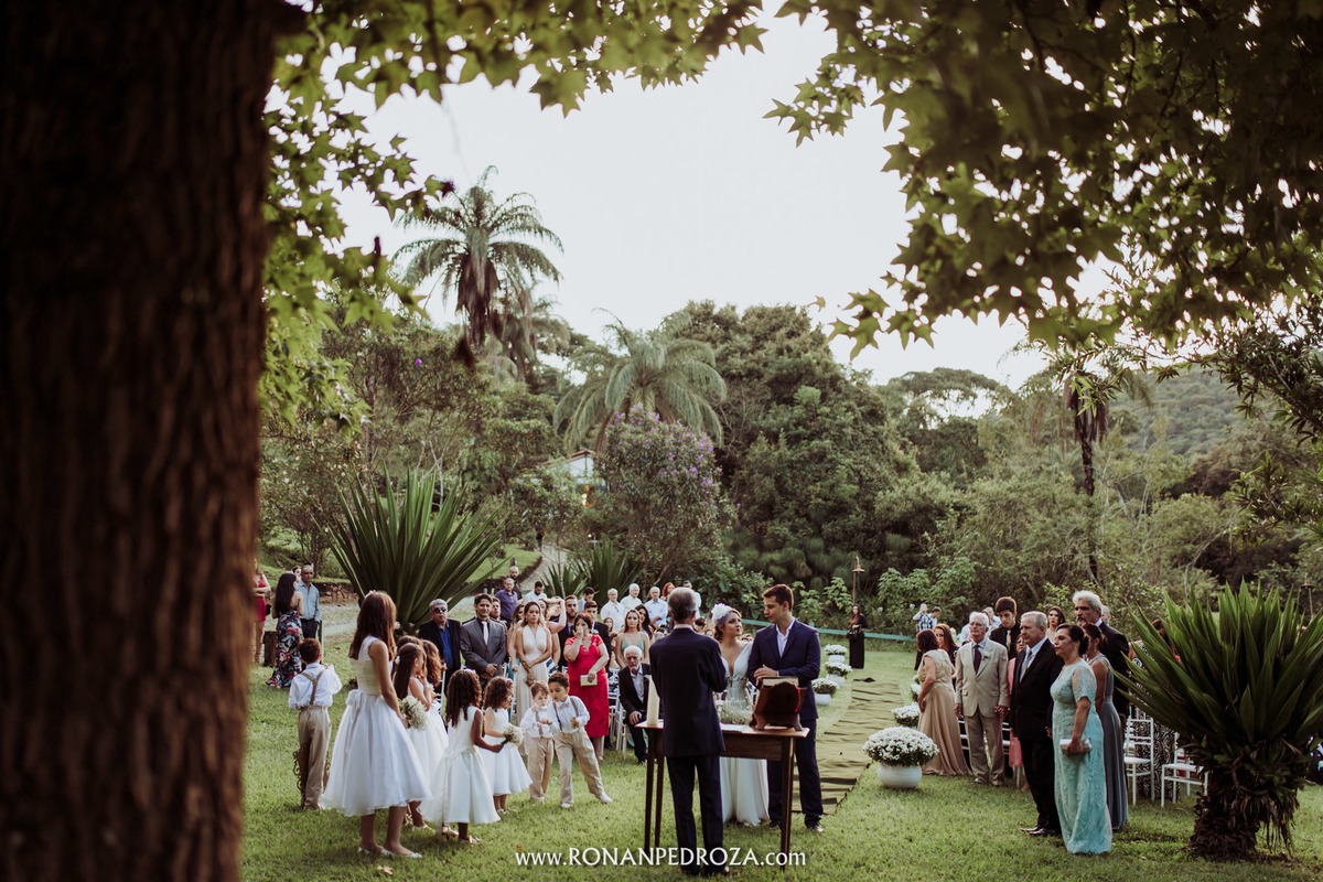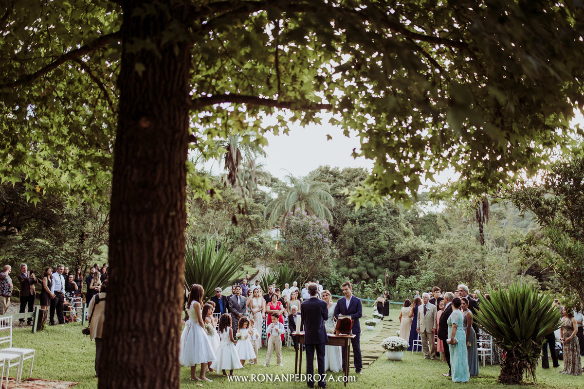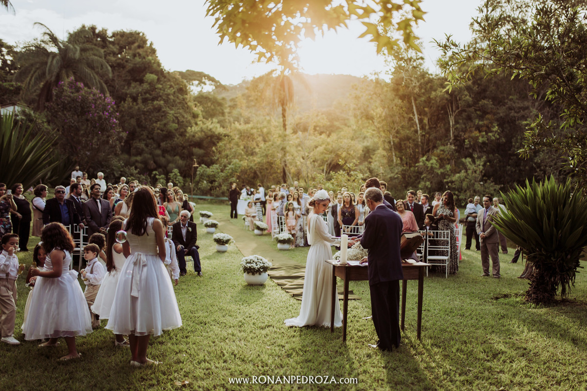 A emoção era tão grande, que dava para sentir a energia que o amor trouxe. Os convidados em lagrimas de alegria, o noivo em seu momento mais emocionante e a noiva, que foi ao altar de pés descalços, para sentir o amor de Deus, as bençãos prometidas e conectada diretamente com a natureza.