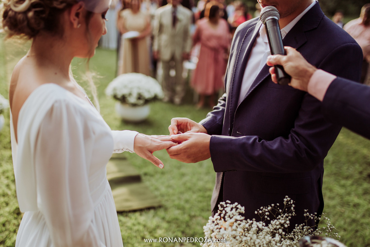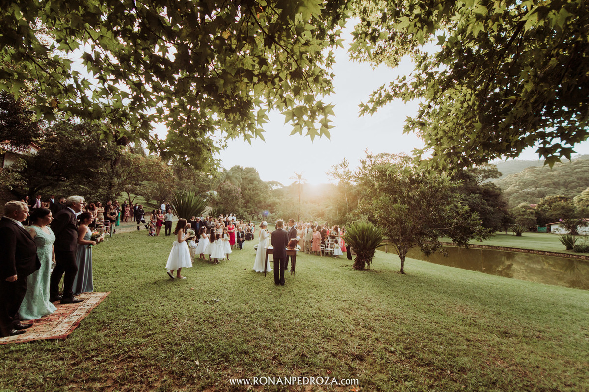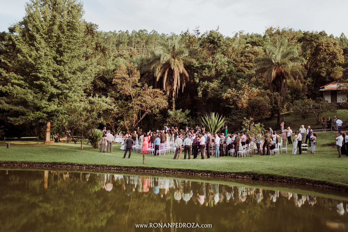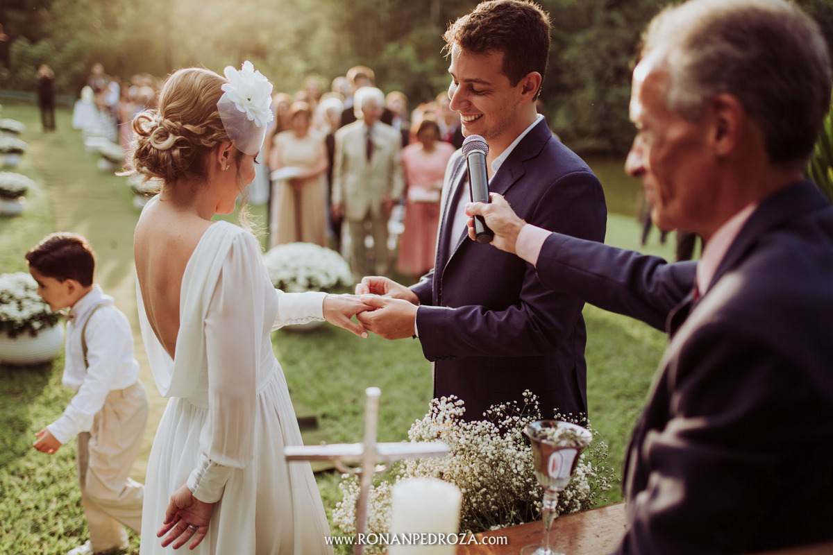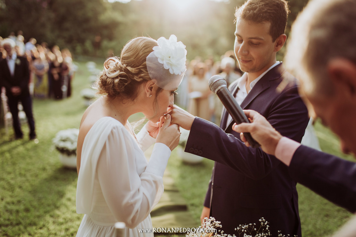 A emoção era tão grande, que dava para sentir a energia que o amor trouxe. Os convidados em lagrimas de alegria, o noivo em seu momento mais emocionante e a noiva, que foi ao altar de pés descalços, para sentir o amor de Deus, as bençãos prometidas e conectada diretamente com a natureza.